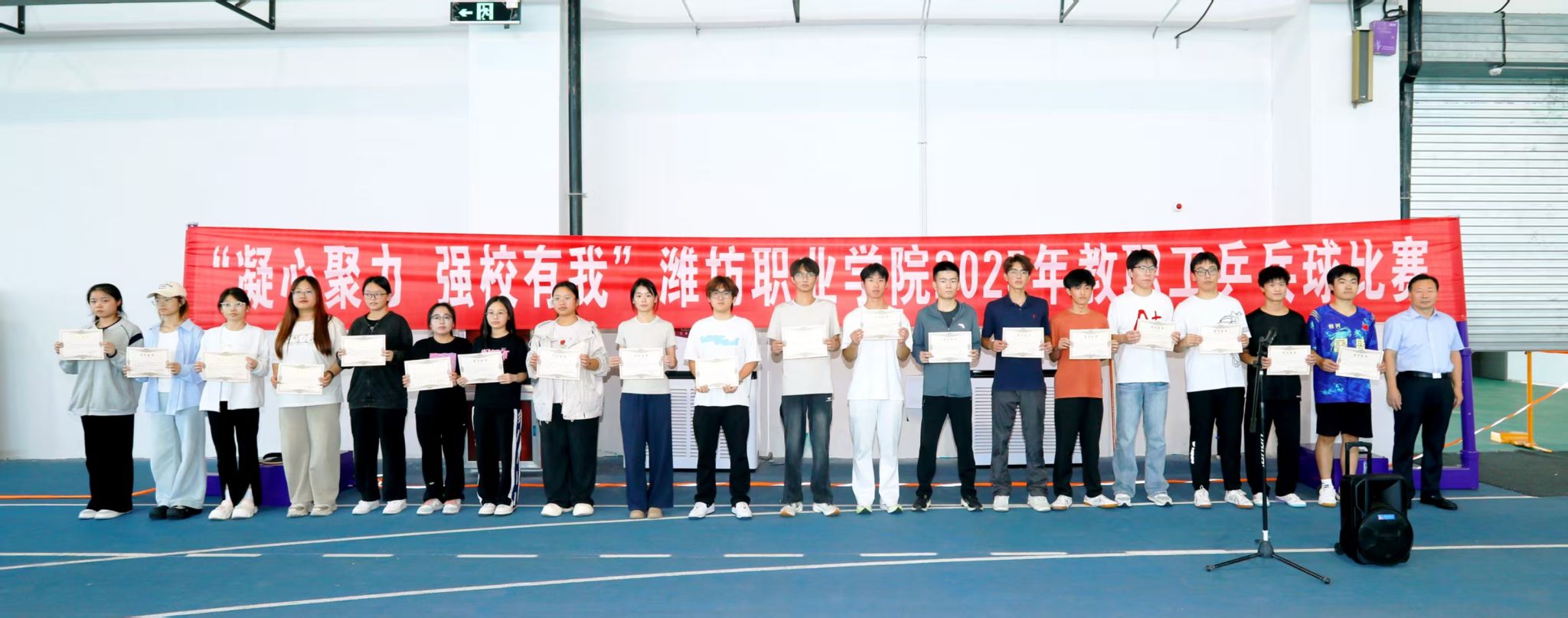 9月22日至25日,“凝心聚力,强校有我”潍坊职业学院教职工乒乓球比赛在滨海校区竞泽广场举行。学院党委书记王浩为比赛开幕致辞并宣布比赛开幕,党委副书记贺志强致闭幕辞并为获奖运动员颁奖,党委委员高凌云主持比赛开幕式和闭幕式。